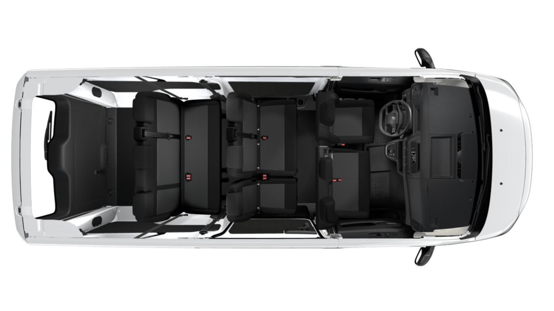 *  Салон с 9 местна конфигурация - двуместна пътническа седалка до водача на ред 1, триместни седалки на ред 2 ( делима 2/3 към 1/3) и 3-местна седалка на ред 3